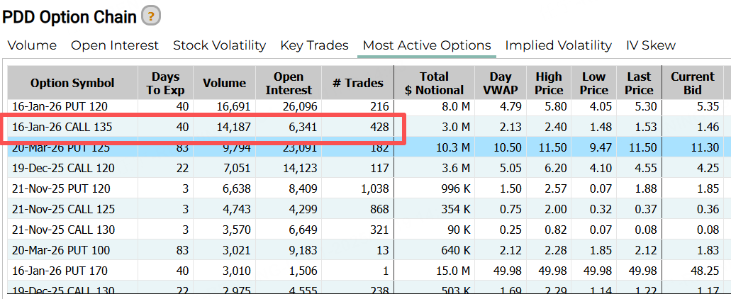 期權方面,拼多多成交前三位的合約都在佈局明年,其中一份2026年1月16日到期的CALL,行權價達135美元,較現價有12%的漲幅空間。