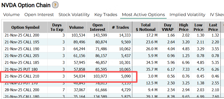 具體來看,英偉達昨日成交量排名前五的合約都是CALL。此外,一份同樣排名前十的認購合約,本週五到期,行權價達210美元,較現價有15%的漲幅空間。