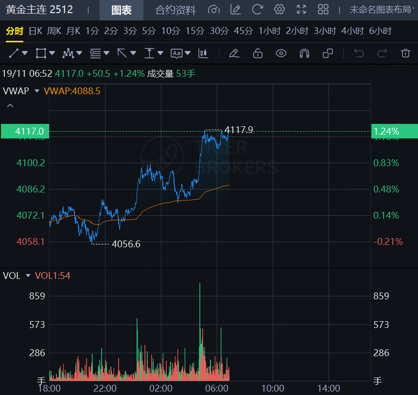 黃金期貨震盪走高,截止發稿,漲1.24%,報4117美元/盎司。