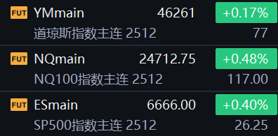 11月19日,美股三大股指期貨齊漲,截止發稿,道指期貨漲0.17%,納指期貨漲0.48%,標普500指數期貨漲0.4%。