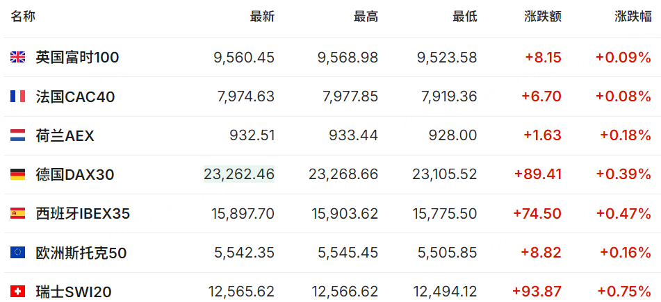 歐洲主要股指全線上漲,截至發稿,英國富時100漲0.09%,法國CAC40漲0.408%,德國DAX30指數漲0.39%。