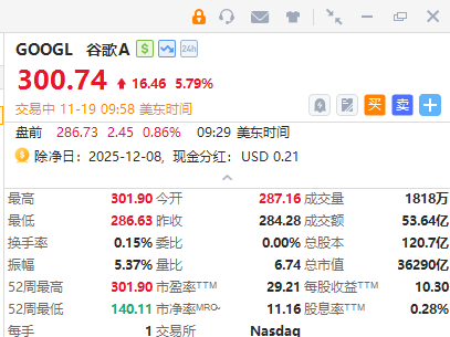谷歌A漲約5.8%,市值突破3.5萬億美元再創新高,新一代AI大模型Gemini 3震撼亮相。