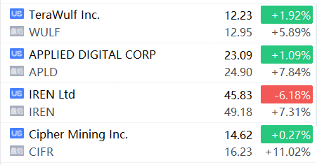 11月20日,加密礦企概念股盤後全線大漲,Cipher Mining漲超11%,IREN、Applied Digital漲超7%,TeraWulf漲近6%。