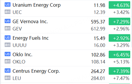 美股核電板塊走強,Centrus Energy漲超7%,Oklo Inc漲超5%,Energy Fuels、GE Vernova、Uranium Energy跟漲。