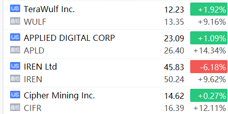 加密礦企概念股盤後全線大漲,APLD漲超14%,CIFR漲超12%,IREN、WULF漲超9%