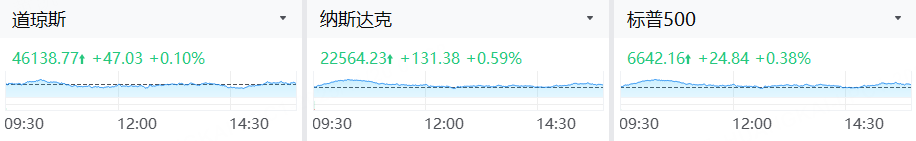 美東時間週三,美股三大指數集體收漲。截至收盤,道瓊斯指數漲0.10%,報46,138.77點;標普500指數漲0.38%,報6,642.16點;納斯達克指數漲0.59%,報22,564.23點。