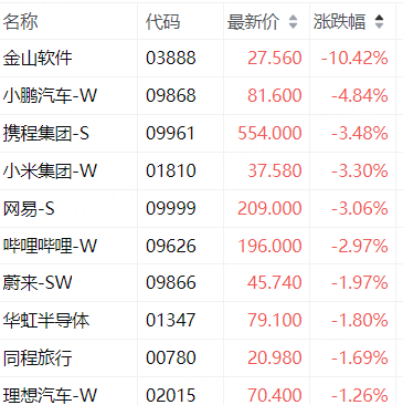 科指成分股中,金山軟件跌超10%,小鵬汽車-W跌近5%,攜程集團-S、網易-S跌超3%。