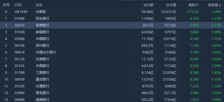 華盛資訊11月20日訊,內銀股集體回暖,截至發稿,民生銀行漲超3%,浙商銀行漲超2%,郵儲銀行、中國銀行、工商銀行漲超1%。