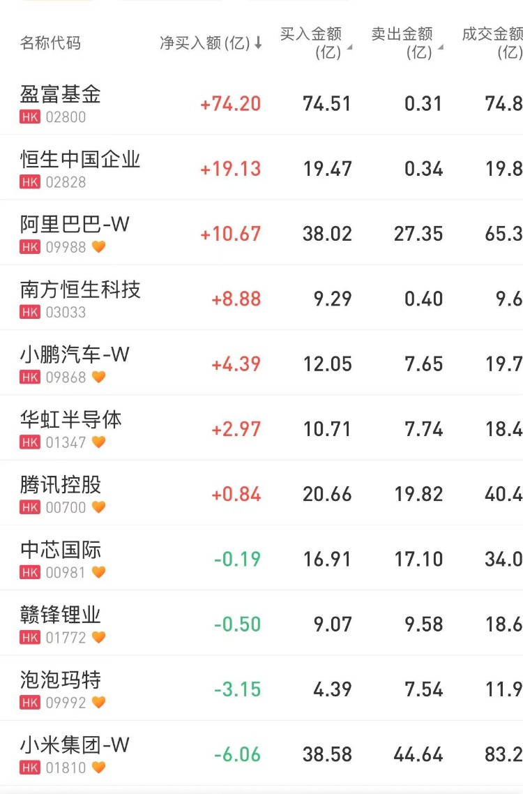 盈富基金、恒生中國企業、阿里巴巴-W分別獲淨買入74.2億港元、19.13億港元、10.67億港元。