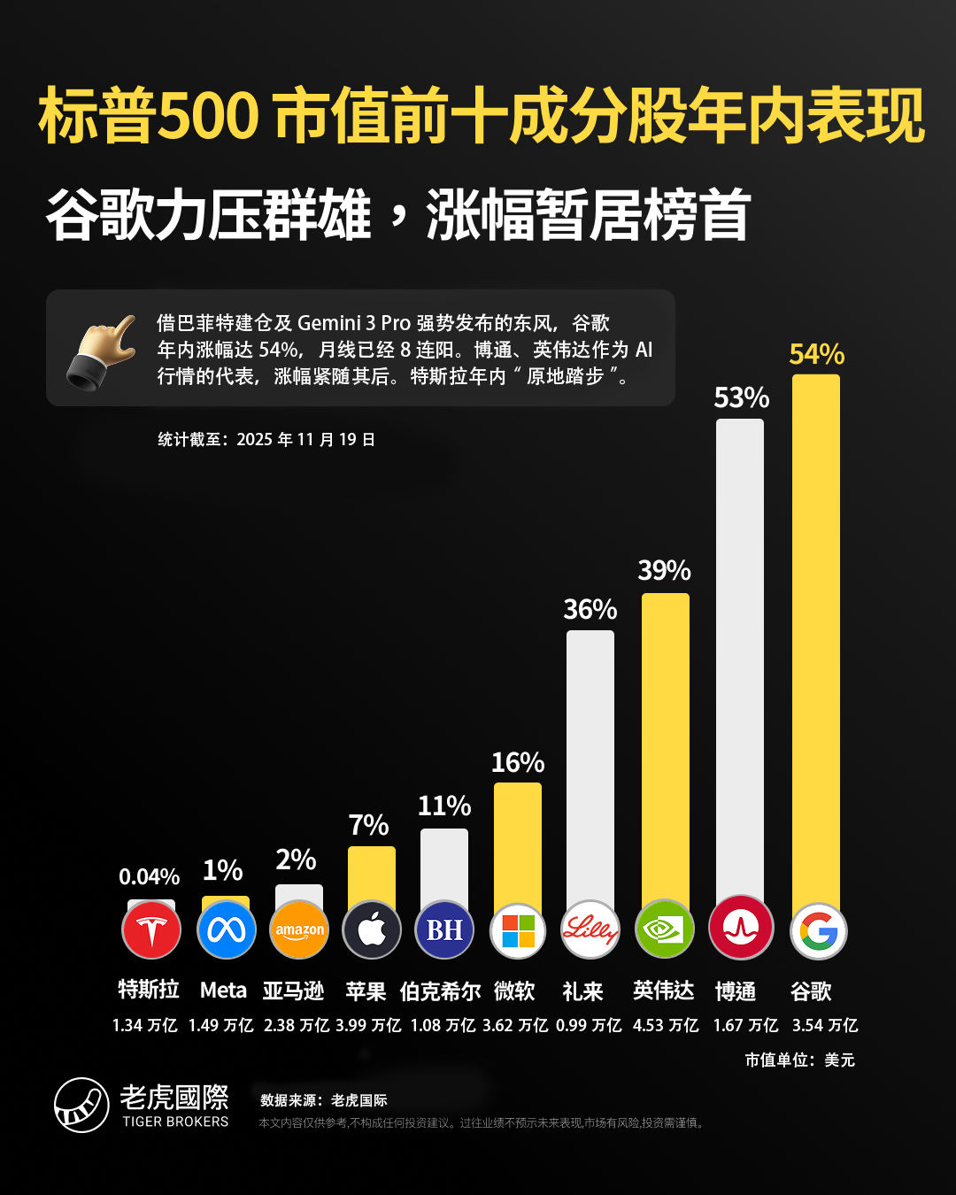 時近歲末,美股巨頭們今年的表現也已拉開差距。在標普500指數前十大市值成分股中,借巴菲特Q3建倉及Gemini 3 Pro強勢發佈的東風, 谷歌 年內漲幅達到54%,月線已經8連陽。 博通 、 英偉達 作爲AI芯片行情的代表,漲幅緊隨其後。 禮來 進一步鞏固在減肥藥市場的領先地位,年內至今漲幅力壓微軟、蘋果。
