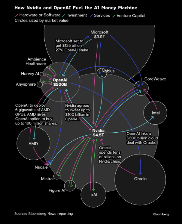 這張“人工智能賺錢機器”圖讓人大開眼界,一目瞭然!英偉達的芯片驅動着一切,OpenAI的模型則爲整個生態系統提供動力。圖表上的每一個箭頭都代表着數十億美元的資金在系統中流動。每一個連接都是對人工智能主導地位的押注。