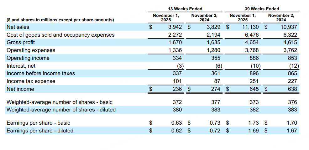 11月21日,Gap盤後發佈2025財年Q3財報,公司三季度淨銷售39.42億美元,分析師預期39.0億美元。