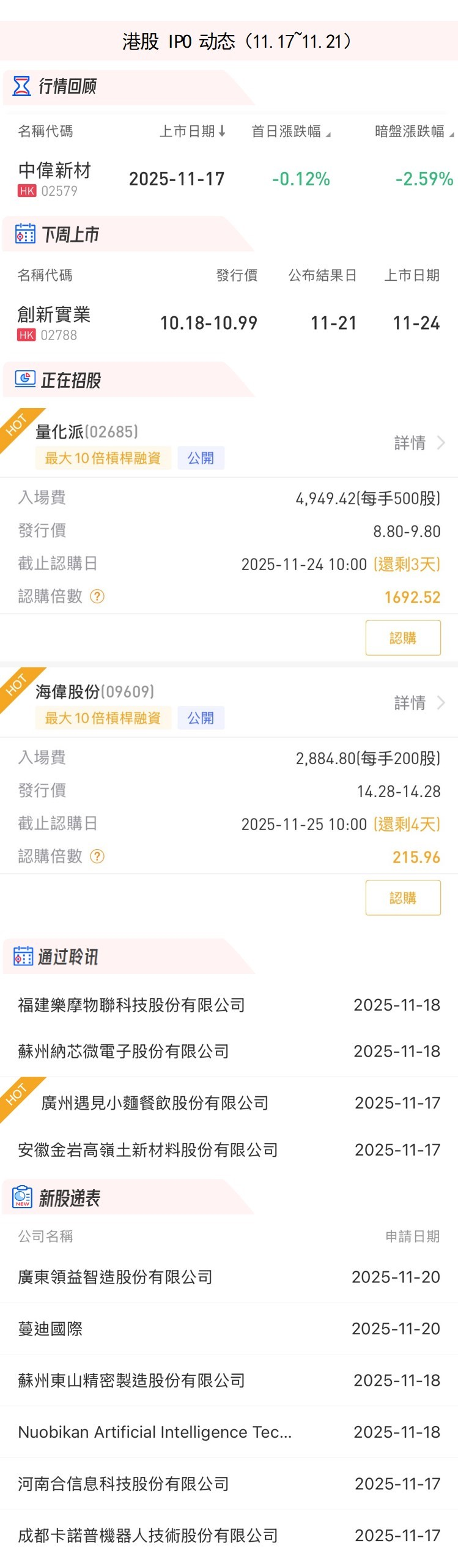 其中電解鋁生產商創新實業截至發稿,暗盤漲超25%,將於下週一掛牌上市;量化派、海偉股份正在招股中;另有4家公司通過聆訊,包含A股半導體上市公司納芯微,以及中國第四大中式麪館經營者遇見小面等公司。