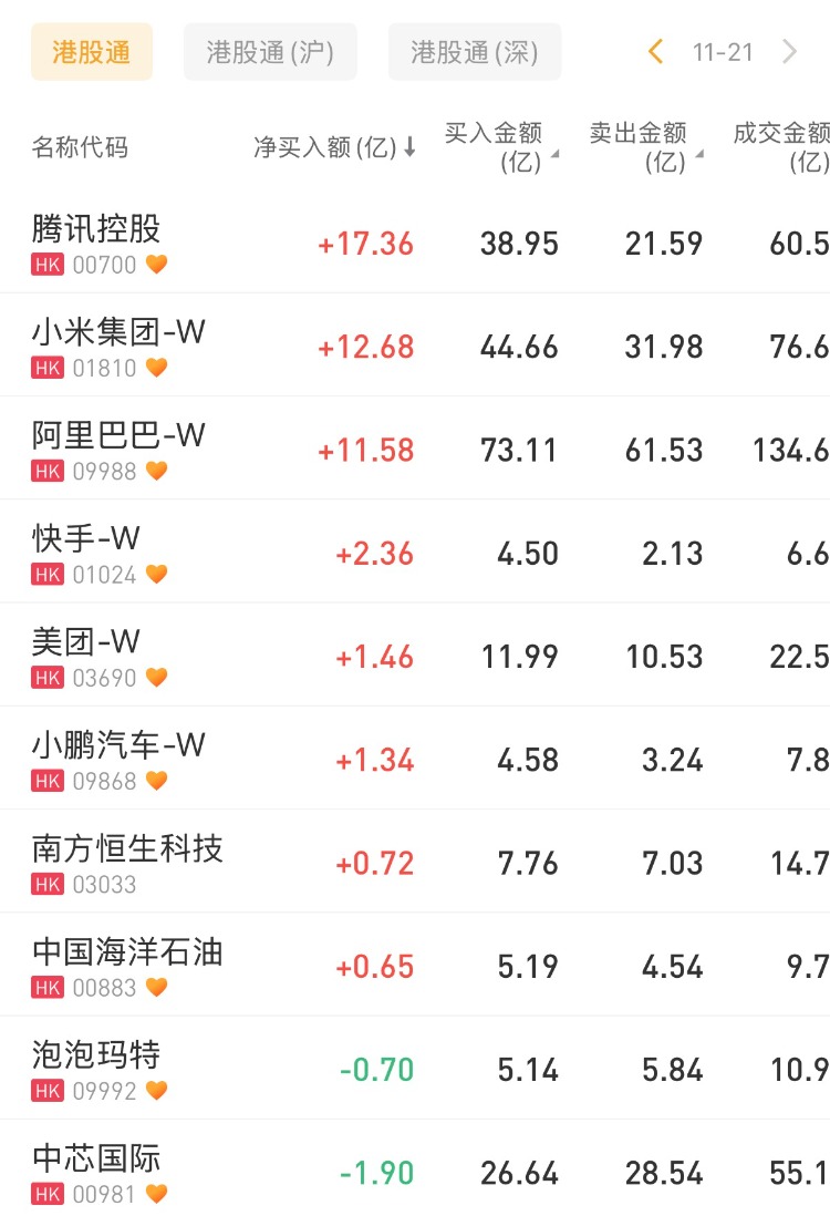 騰訊控股、小米集團-W、阿里巴巴-W分別獲淨買入17.36億港元、12.68億港元、11.58億港元。