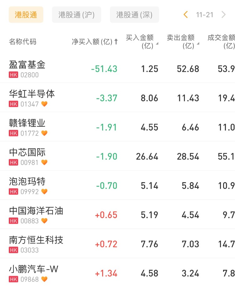 盈富基金、華虹半導體、贛鋒鋰業分別遭淨賣出51.43億港元、3.37億港元、1.91億港元。
