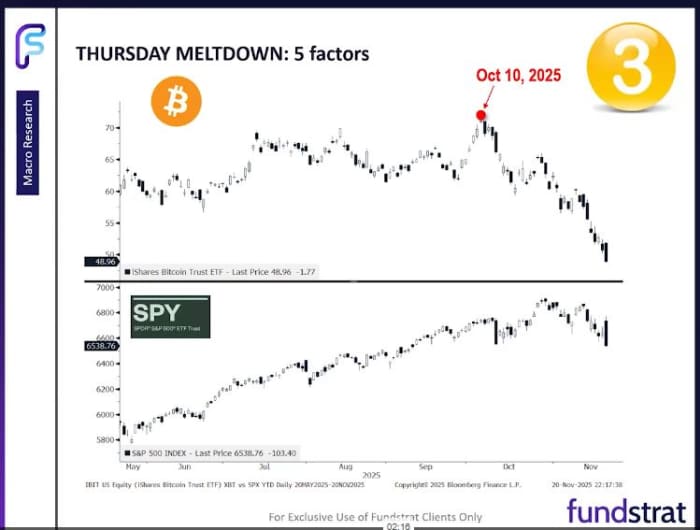 Tom Lee表示:“比特幣在10月10日見頂。我們知道那次見頂與一次加密貨幣的清算事件有關,但之後一直在持續下跌。而標普500在10月29日見頂,約晚了三週。”Tom Lee同時還是以太坊財政管理公司及比特幣礦商 BitMine Immersion Technologies Inc. (BMNR)的董事長。