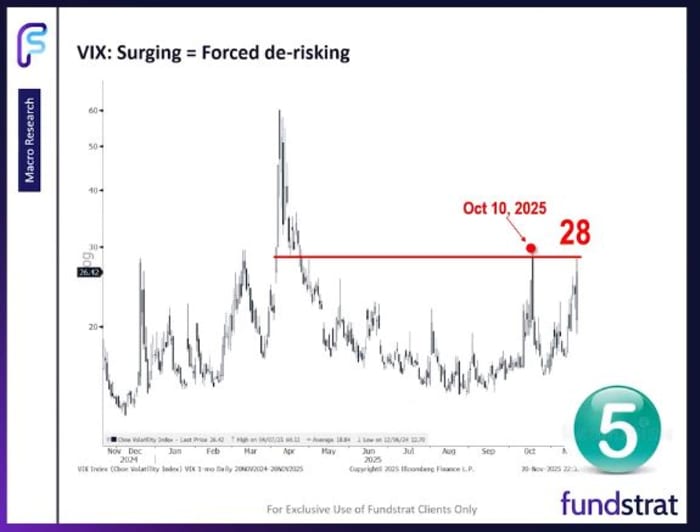 最後的一個因素是 標普500波動率指數(VIX),也就是“恐懼指數”。Tom Lee指出,該指數在週四早盤大幅下挫後又飆升至 28,創一個月新高。