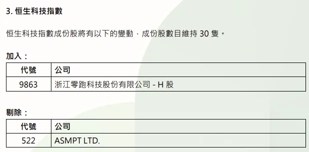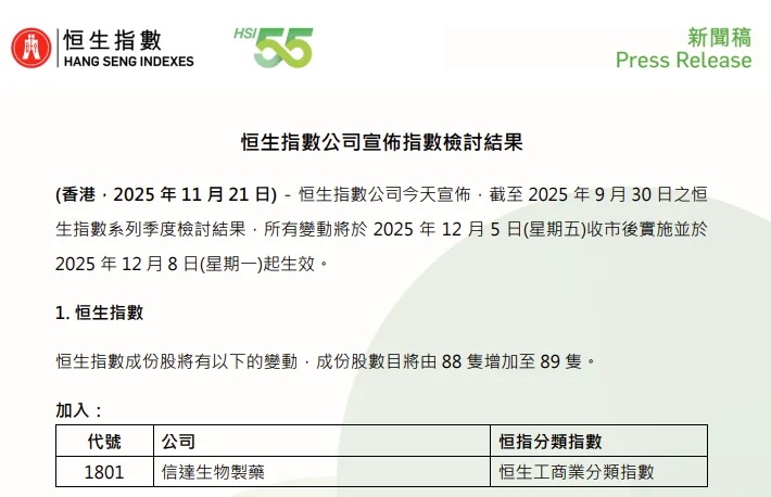 11月21日,恒生指數公司發佈季檢結果:恒生指數納入 信達生物 ,成分股增至89只;恒生科技指數納入 零跑汽車 、剔除 ASMPT ;恒生中國企業指數納入 中國宏橋 、 信達生物 、 百勝中國 ,剔除 新奧能源 、 海底撈 、 新東方-S 。