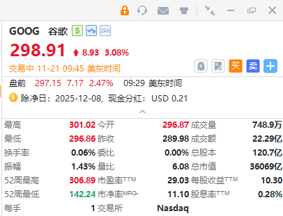 華盛資訊11月21日訊,,谷歌盤初一度漲3.7%,報300.7美元,現漲3.08%;消息面上,公司高管透露該公司需要每六個月將計算能力提升一倍,以滿足需求。