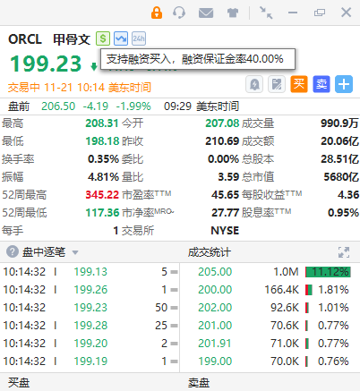 華盛資訊11月21日訊,甲骨文跌幅擴大至超5%,創7月以來新低,股價自9月高點已跌去約40%;