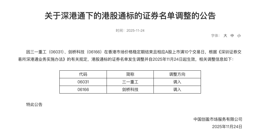 因三一重工、劍橋科技在香港市場價格穩定期結束且相應A股上市滿10個交易日,根據《深圳證券交易所深港通業務實施辦法》的有關規定,港股通標的證券名單發生調整並自2025年11月24日起生效。