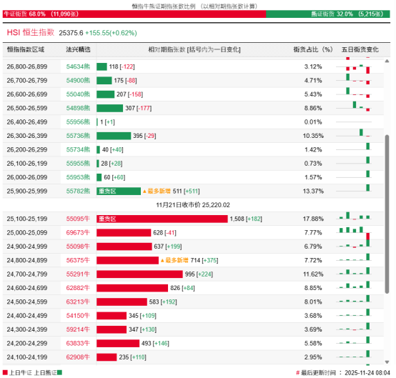 過去5日,恒指牛證合計約3.92億港元資金淨流入;恒指熊證則合計約2.53億港元資金淨流出套現。街貨分佈方面,恒指牛證街貨佔比約68%,分佈在收回價24800點至25200點之間,累計相當約3487張期指合約;恒指熊證街貨在收回價25900點至26400點之間,累計相當約1034張期指合約。