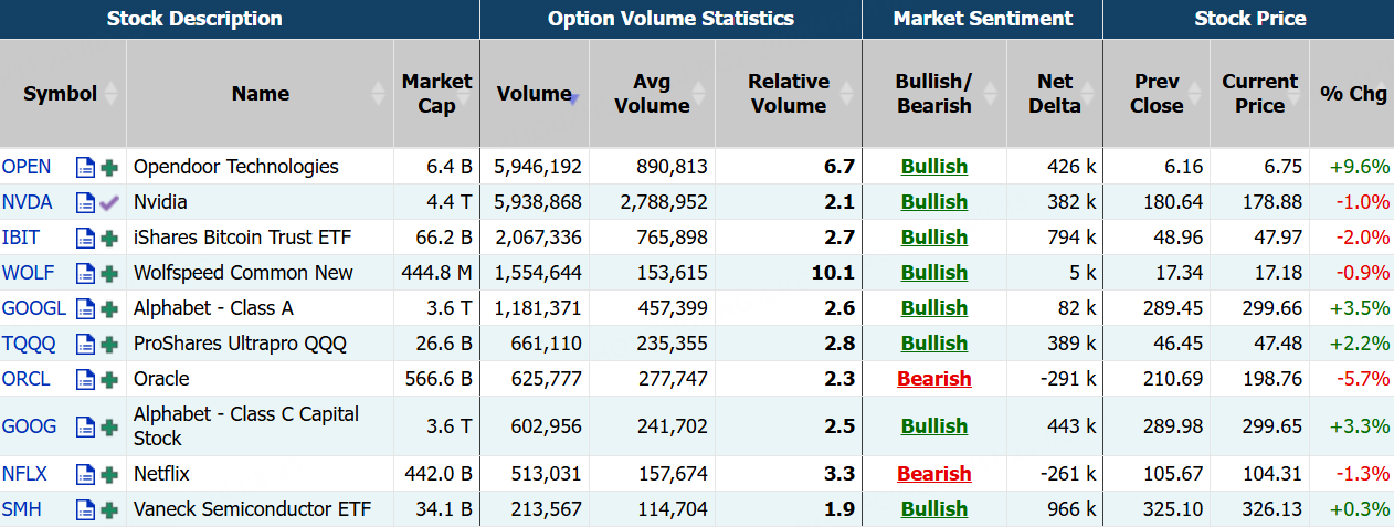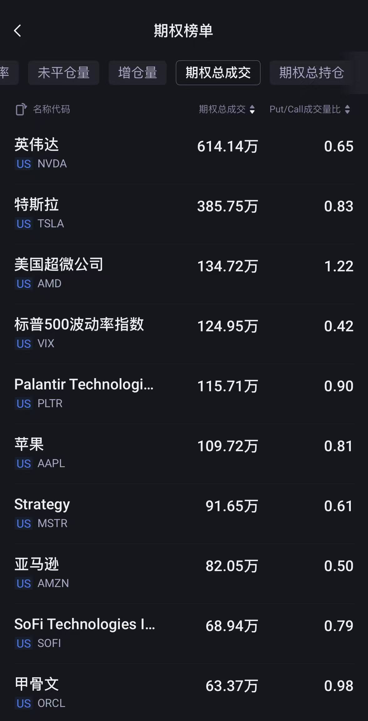 上週五,期權市場總成交量8168.5萬張合約,高於90日均量;谷歌A當日期權成交118.14萬張,較90日均量放大近3倍,看漲期權佔比攀升至62.8%;甲骨文當日期權成交62.58萬張,看漲期權佔比50.4%>>