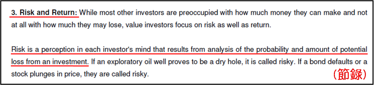 其三是“風險與回報”,當別的大量投資者總是放眼一個投資機會能賺多少,就會忽略箇中導致的可能損失金額;而價投者卻將風險與回報看得同樣重要。風險是每個投資者的盤算,於某投資機會潛在的虧損機率及虧損金額。例如,勘探一個油井時發現它就只是一口枯井;持有的債券最終違約;或者持股的價格大跌,均屬風險。但以上三種投資出現的結果亦可以是那口井是噴井;持債按時履約;或者持股大幅上揚,我們是否就可以說這些投資是毫無風險呢?斷乎不可。