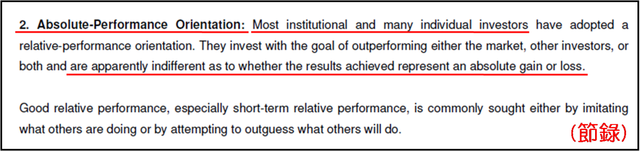 其二是“絕對投資表現導向”,絕大部分的機構投資者和許多個人投資者採用的都是相對投資表現導向的做法。他們的投資目標要麼就是表現優於市場;要麼就是表現優於其他投資者;要麼兩者皆是。他們卻顯然不關心他們的絕對錶現是賺還是蝕。對於較佳相對錶現,尤其對於短期相對錶現的衡量,通常是以模仿別人或嘗試猜想別人做法而行,再作表現比較。價投者則反而着眼於絕對投資表現導向,他們只關心實際回報是否達到了自己所訂的投資目標,而非單純與整體市場或其他投資者的表現比較。