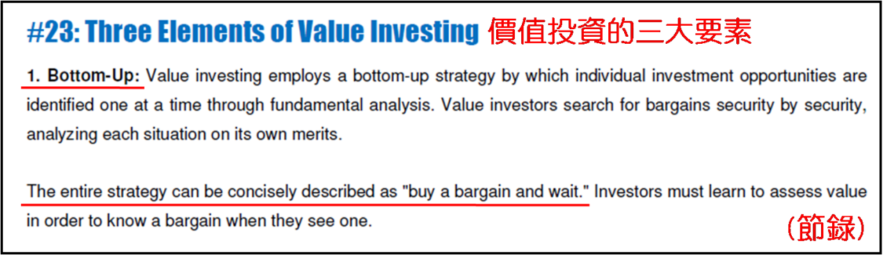 金吾財訊 | 今日看賽思·卡拉曼 (Seth Klarman) 在《安全邊際》提出的30個重要思想的第二十三個,就是“價值投資的三大要素”,內容偏長,筆者直接講解。其一是“自下而上”,價值投資中自下而上的策略就是,通過基本面分析尋找投資機會,每次找一個。價投者會從一個一個的潛在機會篩出有沒有划算的股票,分析每種情況 (景氣、平穩、不景氣) 對應上市公司的價值。這個策略可被扼要描述爲:“買只划算的股票,然後等待收成。”投資者一定要學會評估公司價值,爲要得知當時股價是否划算。接着價投者必須展現等候的耐性和自律,那時不會理會市場上當炒股票是甚麼,或是宏觀經濟看法,直至在芸芸篩選中看到划算的股票出現,纔會出手買入。