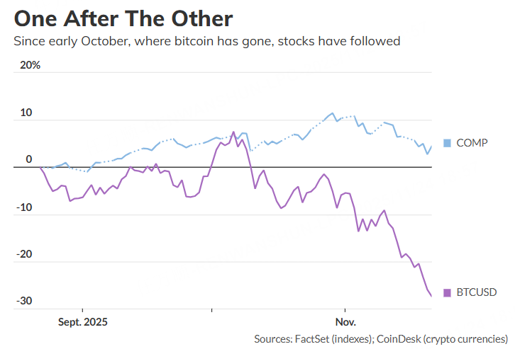 股票和比特幣並非總是同步波動。但最近確實如此。這讓華爾街部分人士擔心,比特幣上週五未能反彈,可能暗示本週股市仍有更多下跌空間。