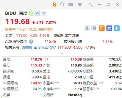百度大漲近8%;摩根大通大幅上調百度目標價:市場嚴重低估AI轉型速度,崑崙芯片明年銷量或飆6倍,驅動雲業務增長61%;