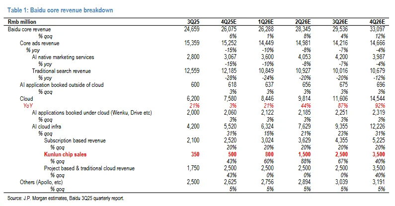 摩根大通預計,百度崑崙芯片收入將從2025年的約人民幣13億元飆升至2026年的83億元,增幅達到6倍。