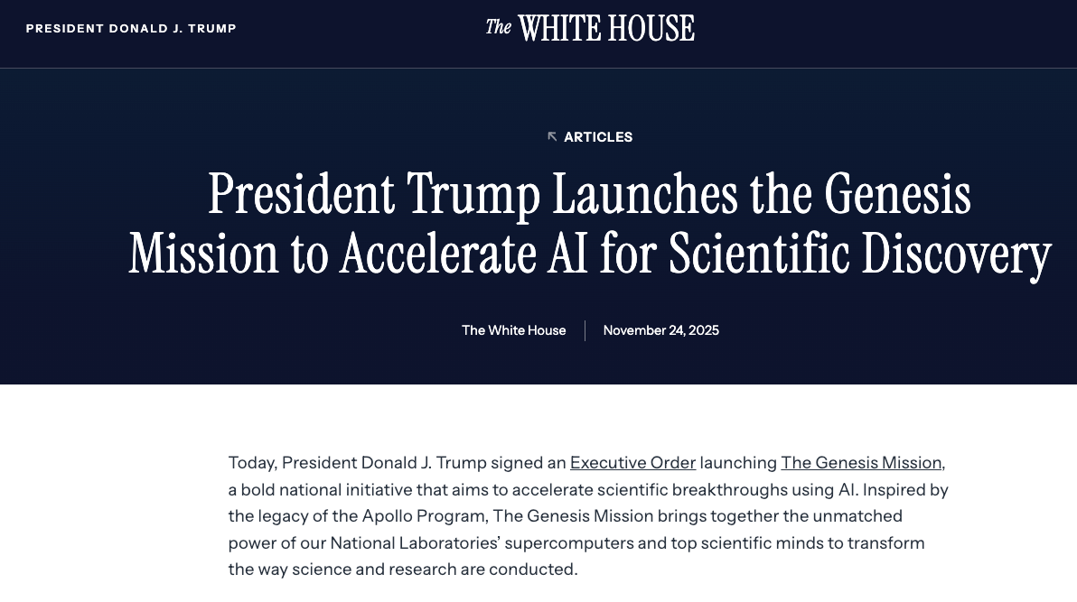 美國白宮正試圖通過應用人工智能來加速提升美國的科研實力。美國總統特朗普週一簽署行政令啓動“創世使命(Genesis Mission)”計劃,要求能源部及其他科研機構積極推進人工智能部署。