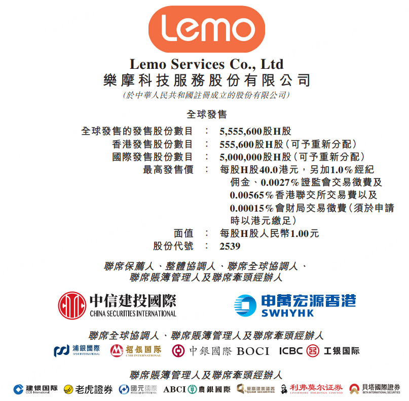11月25日,樂摩科技於11月25日-11月28日招股,擬全球發售555.56萬股股份,香港公開發售佔10%,國際發售佔90%。每股發售價27-40港元,每手100股,預期H股將於12月3日開始在聯交所買賣。