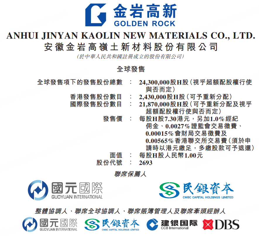 11月25日,金巖高嶺新材於11月25日-11月28日招股,擬全球發售2430萬股H股,香港公開發售佔10%,國際發售佔90%,另有15%超額配股權。每股發售股份7.30港元,每手500股,預期H股將於12月3日開始在聯交所買賣。