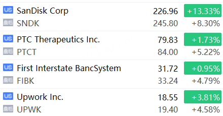消息公佈後:Sandisk股價盤後漲近8%,PTC Therapeutics漲超5%。Upwork、First Interstate BancSystem漲超4%