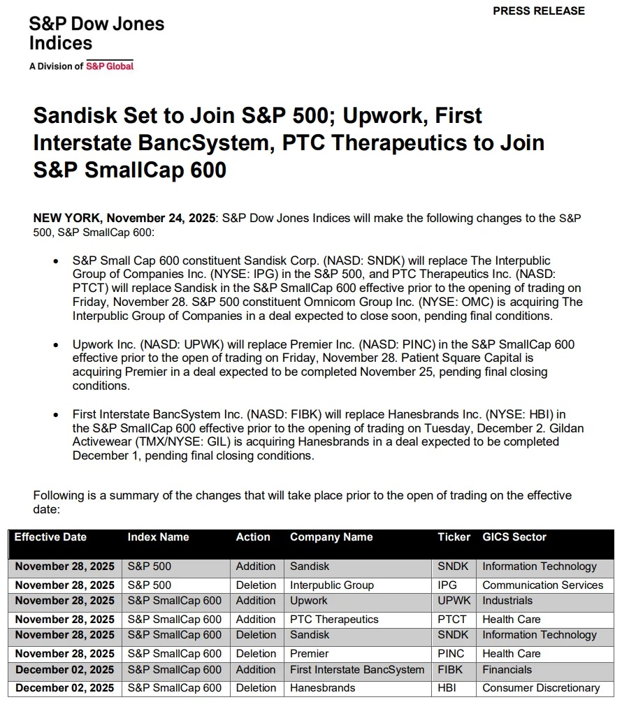 SanDisk Corp將取代埃培智納入標普 500 指數,$PTC Therapeutics(PTCT)$將取代SanDisk納入標普小盤股 600 指數,上述調整將於 11 月 28 日(週五)開盤前生效。