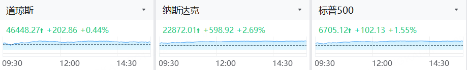 週一(11月24日),美股三大指數集體反彈。截至收盤,納斯達克綜合指數漲2.69%,報22872.01點;道瓊斯指數漲0.44%,報46448.27點;標普500指數漲1.55%,報6705.12點。