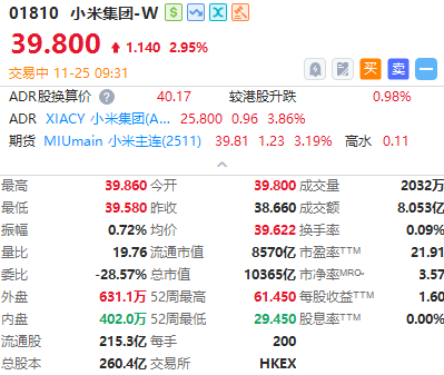 華盛資訊11月25日訊,小米集團-W盤初高開近3%!截至發稿漲2.95%,報39.8港元。