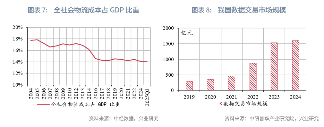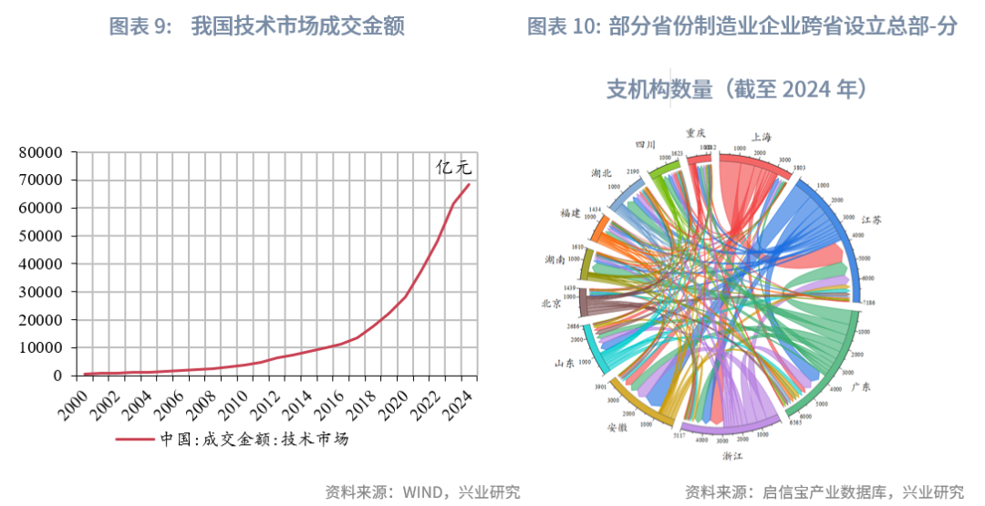 在一系列政策引導下,我國要素自由流動不斷推進,市場“內生造血”能力得到加強,這一趨勢將在“十五五”期間延續。例如:交通方面,物流效率不斷提升,全社會物流成本佔GDP比重從2005年的17.9%下降至2024年的14.1%;數據方面,我國數據交易市場規模從2019年的285億元高速增長至2024年的超過1600億元,數據流通領域從金融、互聯網擴展至醫療、交通、政務等領域;資本與技術方面,我國技術市場成交金額從2015年的不到萬億元上升至2024年的6.8萬億元。不僅如此,產業鏈跨區域聯繫日益頻繁,尤其是廣東、江蘇、浙江、安徽、上海的製造業存續企業跨省設立總部或承接外省分支機構數量佔全國的46.7%(截至2024年)。