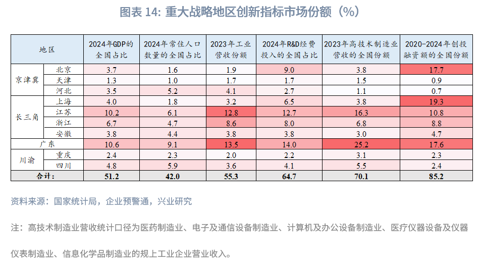 具體到區域層面,經濟大省、重大戰略地區同樣是科技發展的主力地區,仍需起到科技“挑大樑”的作用。廣東、京津冀、長三角、川渝地區等重點區域的經濟總量佔全國51.2%、常住人口占42.0%,而代表科技創新能力的指標占比更高,R&D研究經費投入、高科技製造業營收、創投融資額分別佔全國的64.7%、70.1%、85.2%,重點城市羣作爲科技增長極的領頭作用在因地制宜的佈局思路下將得到進一步發揮。
