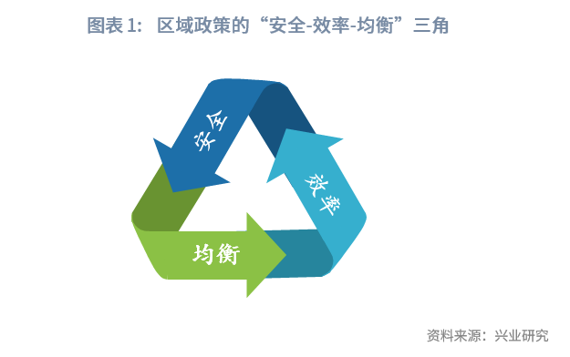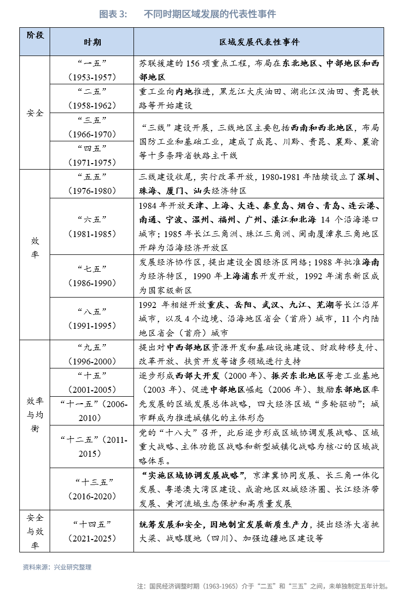 自1953年制定第一個五年計劃以來,我國在不同歷史時期實施了不同導向的區域發展戰略,對區域生產力佈局產生深遠影響。從過去十四個“五年”區域政策的演進脈絡來看,區域政策需要兼顧“安全-效率-均衡”三角,在不同階段,區域政策的重心可能因國內外環境的變化而向其中一角傾斜。