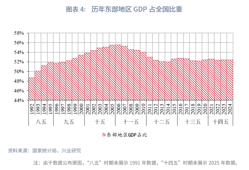 這一時期,東部地區[1]GDP佔全國比重從“八五”初期(1992年)的48.7%,上升到“十一五”初期(2006年)的55.6%,2012年(黨的“十八大”召開)下降至52.3%後逐步穩定,區域協調發展的格局穩步形成。