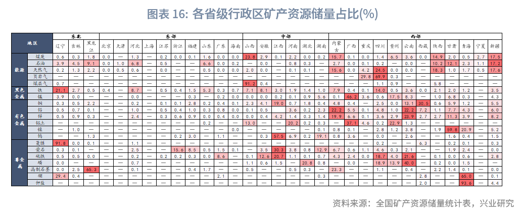 對於礦產資源,“十五五”規劃建議提出“加強戰略性礦產資源勘探開發和儲備”,要提高礦產資源勘查精度、開採效率和綜合利用水平,增加能源資源供給的韌性、彈性和可持續性。山西、甘肅、內蒙古、黑龍江、西藏在國務院批覆的國土空間規劃中定位爲“能源基地”或“礦產基地”,能夠提供充足的石油、煤炭、金屬礦等資源。其中,山西、內蒙古的煤炭儲量分別佔全國的23.8%、15.7%,排名全國第1、第3位;甘肅、黑龍江的石油儲量分別佔全國的12.1%、9.1%;西藏的銅礦(佔比30.5%)、黑龍江的晶制石墨(佔比65.3%)、甘肅的鎳礦(佔比59.8%)儲量都排名全國前列。在保障能源資源供給的同時,資源型省份要進一步推動礦產品精深加工和產業鏈延伸,不斷提高資源產出率,將資源優勢轉化爲現實生產力。