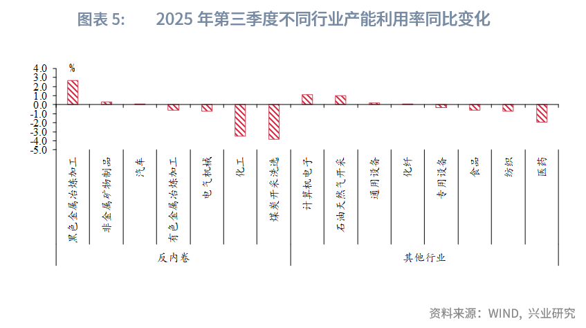 這一轉變是多重因素共同影響的結果。從朱格拉週期(產能週期)來看,我國正處於朱格拉週期的下行期,產能利用率處於歷史較低水平,更需要減少重複投資和低效投資。第三季度我國工業產能利用率錄得74.6%,較上年同期下降0.5個百分點。公佈數據的15個行業中(營收約佔全部工業的64%),黑色金屬加工、非金屬礦物製品、汽車行業的產能利用率高於去年同期,煤炭開採、化工、電氣機械、有色金屬加工的產能利用率低於去年同期,反映反內卷還需持續深化。
