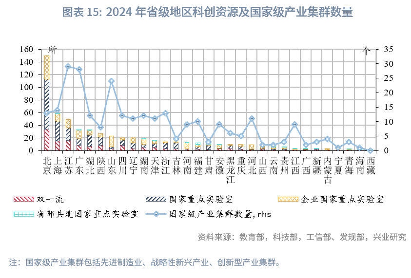 值得關注的是,全國統一大市場建設的持續完善將加速技術要素自由流動,高等院校、科研院所、高科技產業集聚地區的原研創新能力更強,或成爲吸引創新資源的核心磁極,更易產生引領全球的突破性創新技術。這一趨勢下,對於創新要素密集分佈的重點城市羣,則需進一步構建城市羣內創新要素跨區域流動機制,推動科研資金、人才資質互認,使創新效益最大化;對於湖北、陝西等創新院所數量較多的中西部地區,可和當地產業基礎相結合,進一步挖掘創新潛力,探索技術成果本地轉化機制,通過市場化改革培育內生增長能力。對於原研創新基礎較弱的中西部地區,則可探索資源與區位優勢的創新轉化,如清潔能源密集地區發展新能源技術和數字技術、生態敏感地區發展綠色技術、邊境省份依託跨境合作開拓國際市場等,打造資源開發利用新模式。