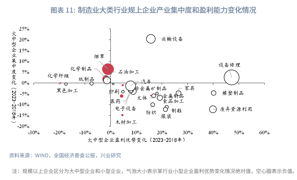 分行業來看,參考我們2025年10月撰寫的《反內卷之產業集中度的視角》報告,2023年較2018年(兩次經濟普查年份)多數製造業行業的規模以上企業落於大中型企業盈利優勢擴大但集中度下降的象限,表明行業分散分佈趨勢明顯且非大中型企業通過讓渡利潤來贏得市場份額的方式廣泛存在。尤其是汽車以及多數勞動密集型製造業的市場份額流向了盈利能力更弱的小型企業,一些小型企業“份額正增長+盈利負增長”導致行業整體財務表現下降,在未來“反內卷”進程中有較大的整合空間。