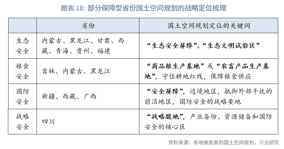 根據國務院批覆的省級行政區國土空間規劃,偏向保障型定位的省份需要“各司其職”。如:生態安全方面,內蒙古、黑龍江、甘肅、西藏、青海是“生態安全屏障”,在水源涵養、防風固沙、氣候調節、災害防控等方面發揮不可替代的作用。此外,福建、江西、貴州、海南是國家批覆的生態文明試驗區,國土空間規劃中將生態文明試驗區納入定位的是福建、貴州。