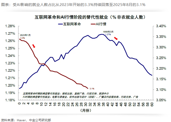麥肯錫調查顯示,受訪者表示當前使用AI可減少9~11%的成本。如果僅粗略的從標普500的維度來看,SG&A總規模約3萬億美元,約等於一年可以節省3000億美元的成本,相當於Open AI 200億美元年化收入的15倍。同時,AI也更快地提升了勞動生產率。自2023年以來,美國非農商業部門的勞動生產率已經抬升5.6%,提升速度快於1995~2000年互聯網革命時期,抬升幅度接近1997年底水平。